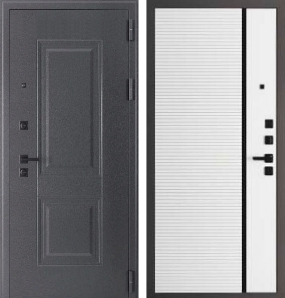 Отделка двери Берлин штамп 2 Пиано снаружи - металл, штамп 2, цвет AkzoNobel Металлик графит, отделка внутри - фрезерованная панель, вставка из черного стекла, цвет Велюр белый.