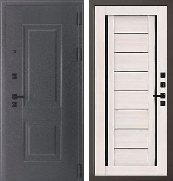 Отделка двери Берлин штамп 2 Q 33 снаружи - металл, штамп 2, цвет AkzoNobel Металлик графит, отделка внутри - царговая панель, вставки из черного стекла, цвет Лиственница белая.