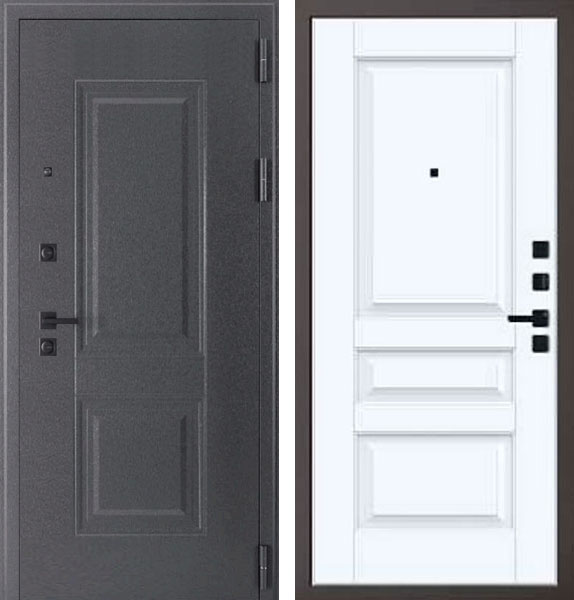 Отделка двери Берлин штамп 2 QL 3 снаружи - металл, штамп 2, цвет AkzoNobel Металлик графит, отделка внутри - фрезерованная панель, цвет Велюр белый.