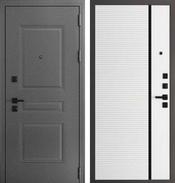 Отделка двери Берлин штамп 3 Пиано снаружи - металл, штамп 2, цвет AkzoNobel Металлик графит, отделка внутри - фрезерованная панель, вставка из черного стекла, цвет Велюр белый.
