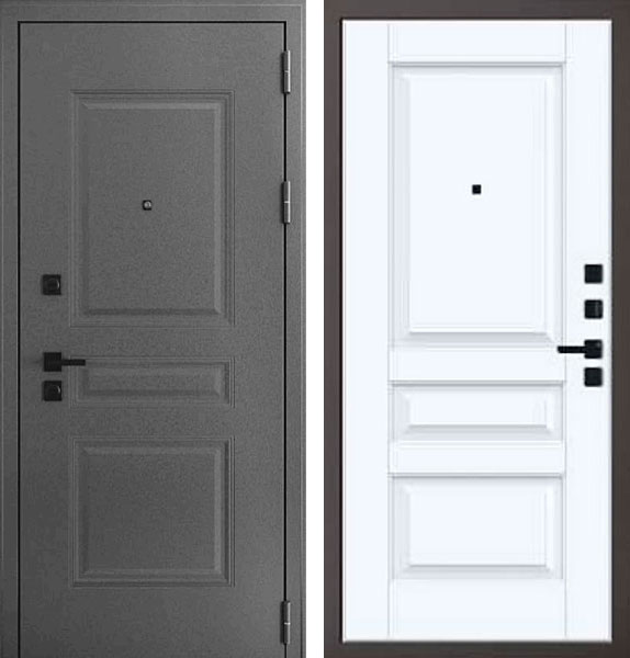 Отделка двери Берлин штамп 3 QL 3 снаружи - металл, штамп 2, цвет AkzoNobel Металлик графит, отделка внутри - фрезерованная панель, цвет Велюр белый.