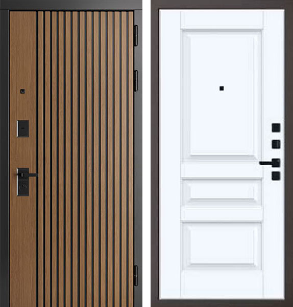 Отделка двери Бордо QL 3 снаружи - МДФ-панель, Дуб кантри темный + Патина черная, отделка внутри - фрезерованная панель, цвет Велюр белый.