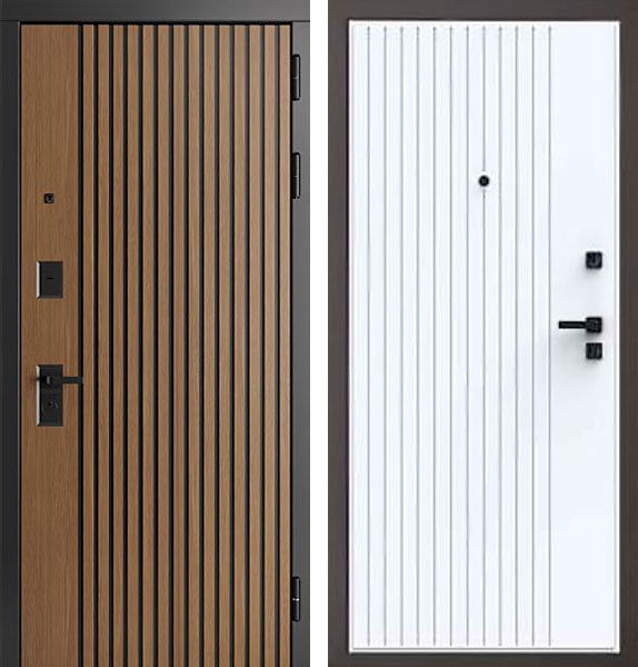 Отделка двери Бордо QMS 16 снаружи - МДФ-панель, Дуб кантри темный + Патина черная, отделка внутри - фрезерованная панель, цвет Велюр белый.