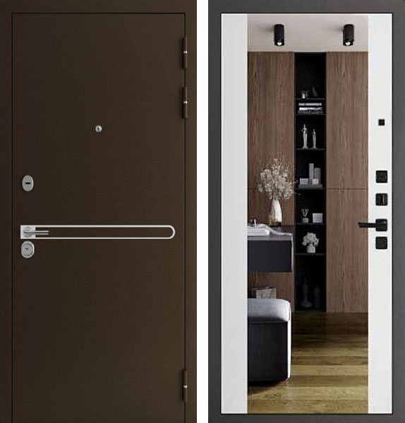 Отделка двери Лайт Алиса снаружи - металл, вставка из нержавеющей стали, цвет Антик медь, отделка внутри - панель с зеркалом, цвет Софт белый.