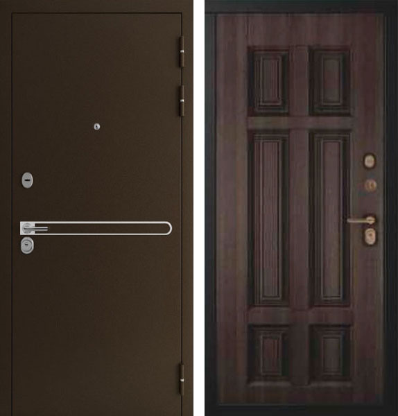 Отделка двери Лайт Квадро снаружи - металл, вставка из нержавеющей стали, цвет Антик медь, отделка внутри - фрезерованная панель, винорит, цвет Венге.