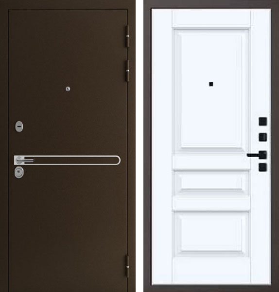 Отделка двери Лайт QL 3 снаружи - металл, вставка из нержавеющей стали, цвет Антик медь, отделка внутри - фрезерованная панель, цвет Велюр белый.