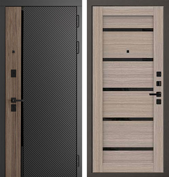 Отделка двери Neo Q 55 снаружи - МДФ-панель, Черный кварц, вставка Орех коньяк, отделка внутри - царговая панель, вставки из черного стекла, цвет Дуб скальный.