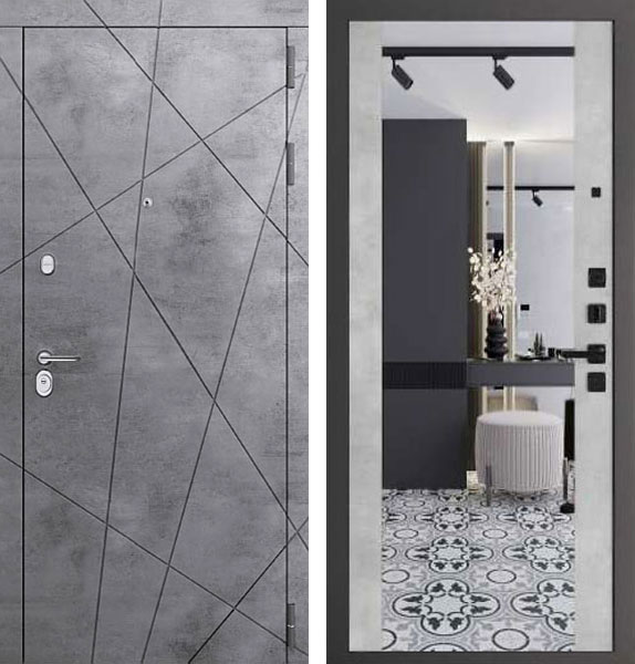 Отделка двери Президент Алиса снаружи - МДФ-панель, Бетон темный, отделка внутри - панель с зеркалом, цвет Бетон светлый.