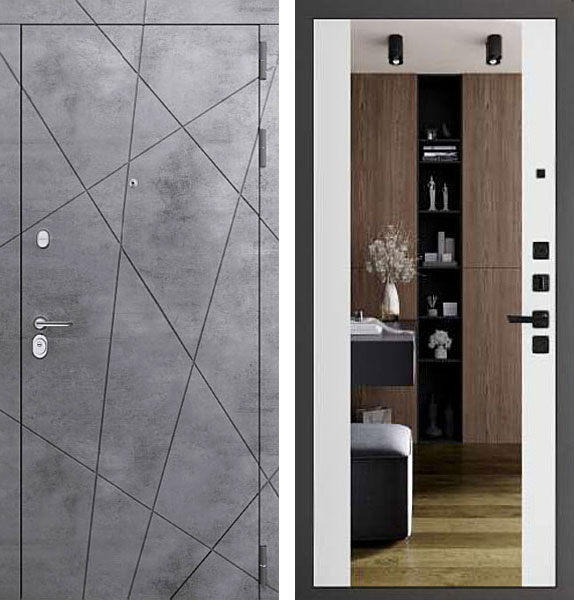 Отделка двери Президент Алиса снаружи - МДФ-панель, Бетон темный, отделка внутри - панель с зеркалом, цвет Софт белый.