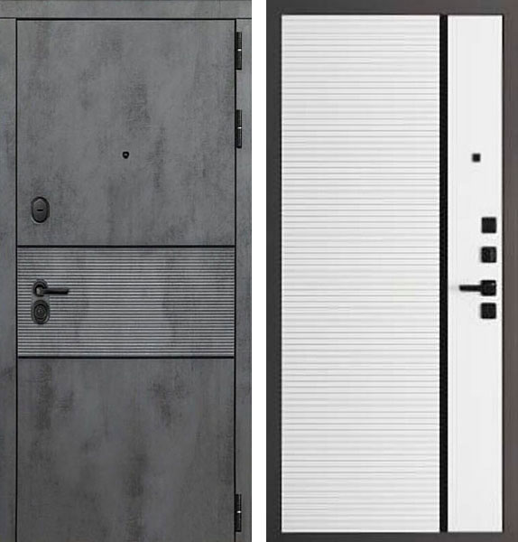 Отделка двери Сенатор Пиано снаружи - МДФ-панель, Бетон темный, вставка Черные молдинги, отделка внутри - фрезерованная панель, вставка из черного стекла, цвет Велюр белый.