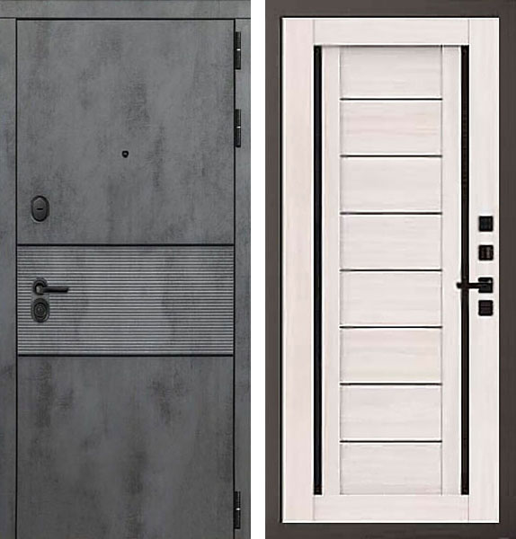 Отделка двери Сенатор Q 33 снаружи - МДФ-панель, Бетон темный, вставка Черные молдинги, отделка внутри - царговая панель, вставки из черного стекла, цвет Лиственница белая.