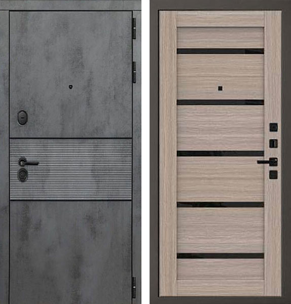 Отделка двери Сенатор Q 55 снаружи - МДФ-панель, Бетон темный, вставка Черные молдинги, отделка внутри - царговая панель, вставки из черного стекла, цвет Дуб скальный.