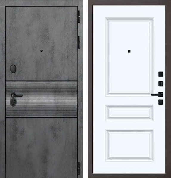 Отделка двери Сенатор QE 3 снаружи - МДФ-панель, Бетон темный, вставка Черные молдинги, отделка внутри - фрезерованная панель, цвет Велюр белый.