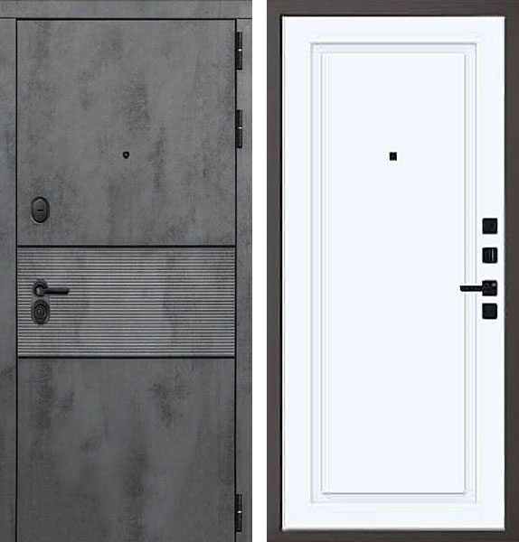 Отделка двери Сенатор QIT 5 снаружи - МДФ-панель, Бетон темный, вставка Черные молдинги, отделка внутри - фрезерованная панель, цвет Велюр белый.