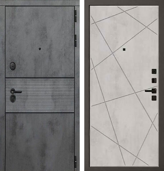 Отделка двери Сенатор QML 1 снаружи - МДФ-панель, Бетон темный, вставка Черные молдинги, отделка внутри - панель, цвет Бетон светлый.