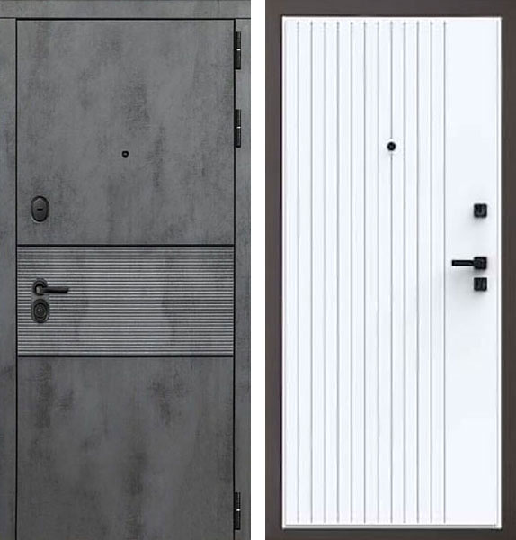Отделка двери Сенатор QMS 16 снаружи - МДФ-панель, Бетон темный, вставка Черные молдинги, отделка внутри - фрезерованная панель, цвет Велюр белый.