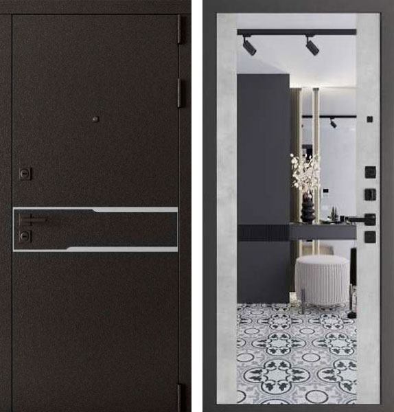 Отделка двери Сицилия Алиса снаружи - металл, лазерная резка, вставка из нержавеющей стали, цвет AkzoNobel Букле графит, отделка внутри - панель с зеркалом, цвет Бетон светлый.