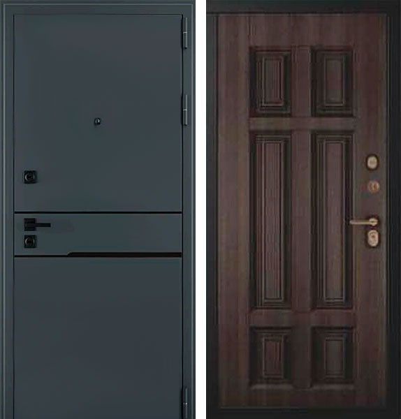 Отделка двери Сицилия Black Квадро снаружи - металл, лазерная резка, вставка Черный муар, цвет AkzoNobel Металлик графит, отделка внутри - фрезерованная панель, винорит, цвет Венге.
