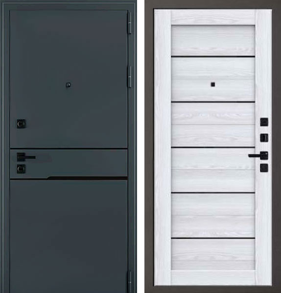 Отделка двери Сицилия Black Q 12 снаружи - металл, лазерная резка, вставка Черный муар, цвет AkzoNobel Металлик графит, отделка внутри - царговая панель, вставки из черного стекла, цвет Клен айс.