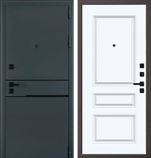 Отделка двери Сицилия Black QE 3 снаружи - металл, лазерная резка, вставка Черный муар, цвет AkzoNobel Металлик графит, отделка внутри - фрезерованная панель, цвет Велюр белый.
