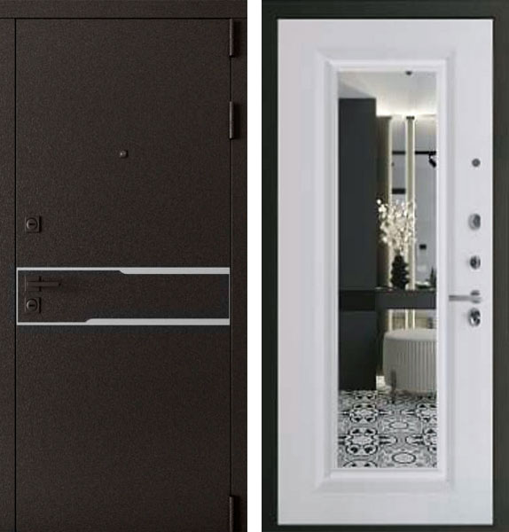 Отделка двери Сицилия Мелисса снаружи - металл, лазерная резка, вставка из нержавеющей стали, цвет AkzoNobel Букле графит, отделка внутри - панель с зеркалом фацет, цвет Софт белый.