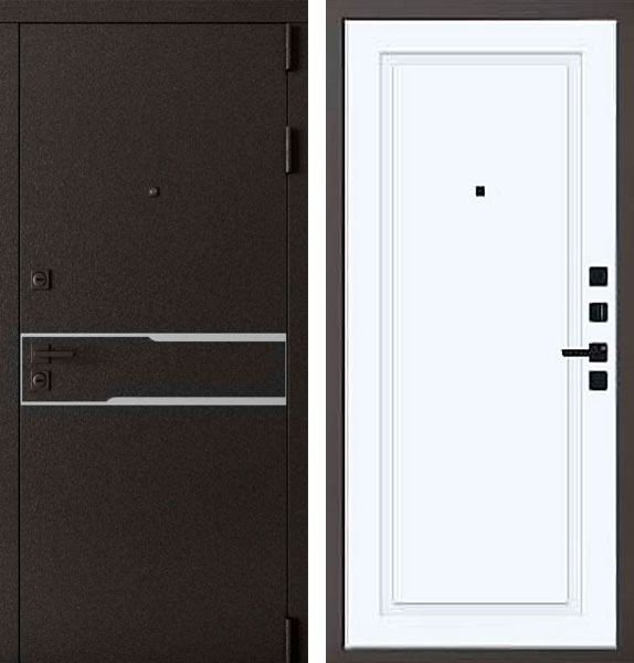 Отделка двери Сицилия QIT 5 снаружи - металл, лазерная резка, вставка из нержавеющей стали, цвет AkzoNobel Букле графит, отделка внутри - фрезерованная панель, цвет Велюр белый.