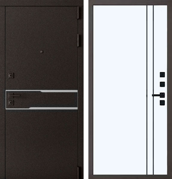 Отделка двери Сицилия QMA 10 снаружи - металл, лазерная резка, вставка из нержавеющей стали, цвет AkzoNobel Букле графит, отделка внутри - панель, черный молдинг, цвет Велюр белый.