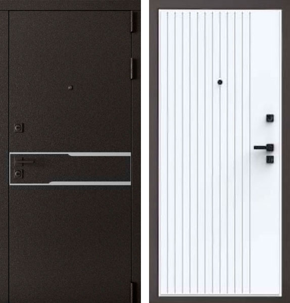 Отделка двери Сицилия QMS 16 снаружи - металл, лазерная резка, вставка из нержавеющей стали, цвет AkzoNobel Букле графит, отделка внутри - фрезерованная панель, цвет Велюр белый.