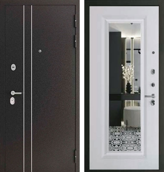 Отделка двери Сити Мелисса снаружи - металл, вставки из нержавеющей стали, цвет Букле темный, отделка внутри - панель с зеркалом фацет, цвет Софт белый.