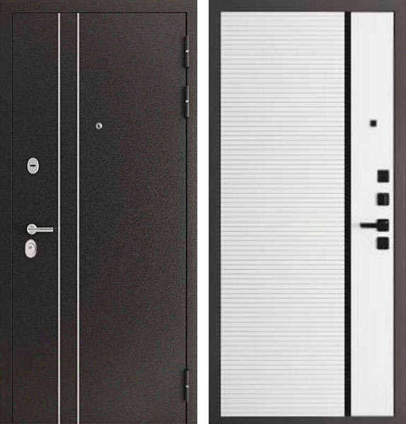 Отделка двери Сити Пиано снаружи - металл, вставки из нержавеющей стали, цвет Букле темный, отделка внутри - фрезерованная панель, вставка из черного стекла, цвет Велюр белый.
