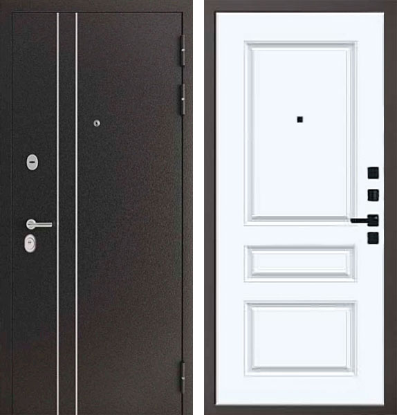 Отделка двери Сити QE 3 снаружи - металл, вставки из нержавеющей стали, цвет Букле темный, отделка внутри - фрезерованная панель, цвет Велюр белый.