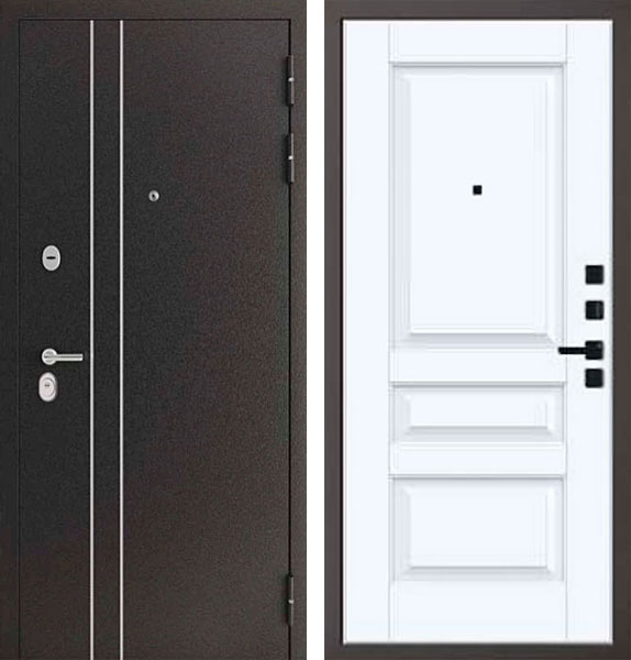 Отделка двери Сити QL 3 снаружи - металл, вставки из нержавеющей стали, цвет Букле темный, отделка внутри - фрезерованная панель, цвет Велюр белый.