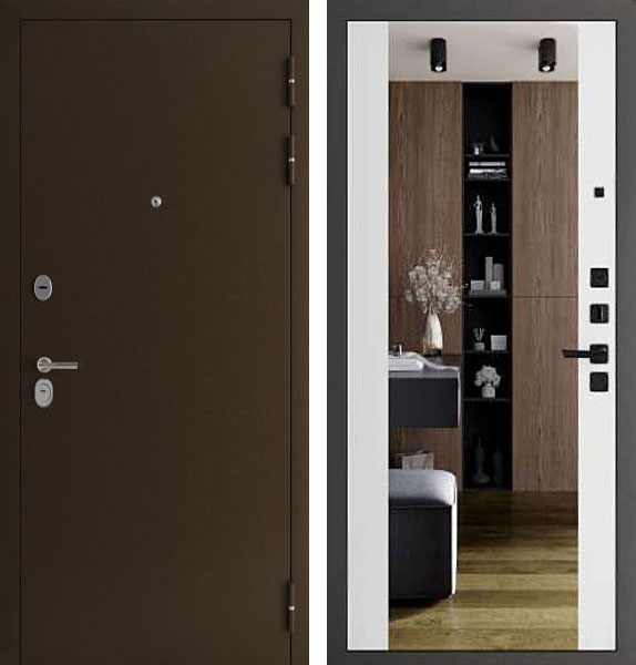 Отделка двери Спарта Алиса снаружи - металл, цвет Антик медь, отделка внутри - панель с зеркалом, цвет Софт белый.