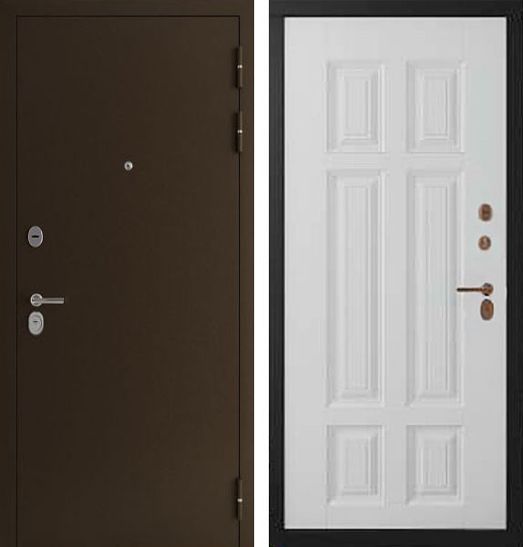 Отделка двери Спарта Квадро снаружи - металл, цвет Антик медь, отделка внутри - фрезерованная панель, винорит, цвет Белый матовый.