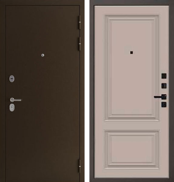 Отделка двери Спарта QBS 1 снаружи - металл, цвет Антик медь, отделка внутри - фрезерованная панель, цвет Велюр темный.