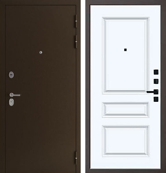 Отделка двери Спарта QE 3 снаружи - металл, цвет Антик медь, отделка внутри - фрезерованная панель, цвет Велюр белый.