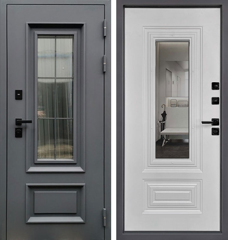 Отделка двери Термо Аляска снаружи - металл, цвет Серый муар+цинк, отделка внутри - фрезерованная панель с зеркалом, цвет Белый.